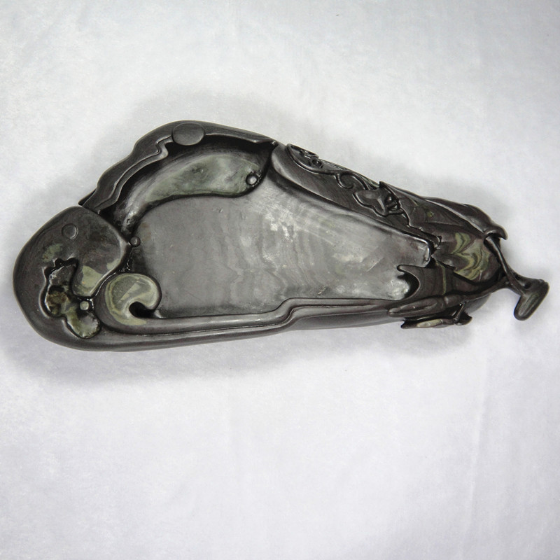 祁阳石有两大类,一类为浅绿色,因其彩色的质地,深色的纹路,如云烟状,又称“文石”,俗话叫“花石板”,用来镶嵌到各种器皿上,也很好看,很有品位。明清时颇多出产,曾经盛销一时。另一类,石头通体为紫色,中间夹有青绿石纹,称“紫袍玉带”。此外,还有黄褐、深褐、朱紫、橄榄绿、乳白色、黑色等,祁阳石雕琢成砚,是价值不菲的石砚精品。